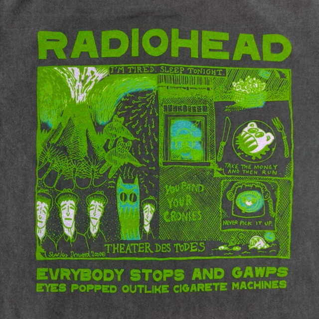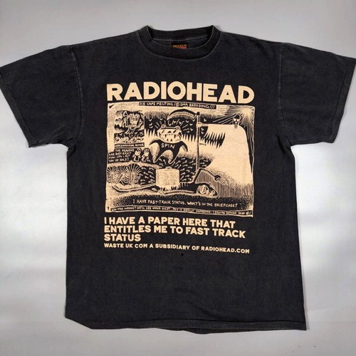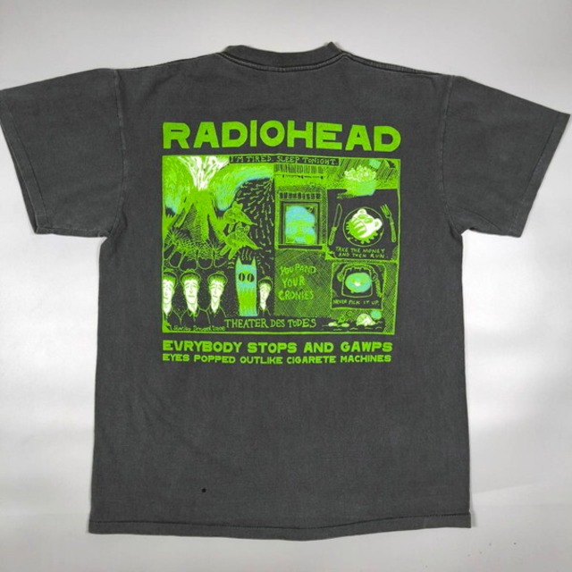 RADIOHEAD レディオヘッド Tシャツになります。 ※ビンテージ加工の新品未使用品になります。 【サイズ】 XL 肩幅: 51cm 袖丈: 20cm 身丈: 71cm 身幅: 54cm ※サイズ表記は目安です。 縫製製品は特性上、若干の誤差はお許しください。