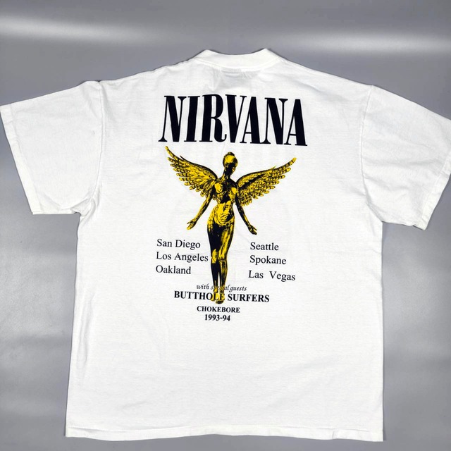 NIRVANA SLIVER tee ニルヴァーナ Tシャツになります。 ※ビンテージ加工の新品未使用品になります。 【サイズ】 XL 肩幅: 56cm 袖丈: 21cm 身丈: 76cm 身幅: 59cm ※サイズ表記は目安です。 縫製製品は特性上、若干の誤差はお許しください。