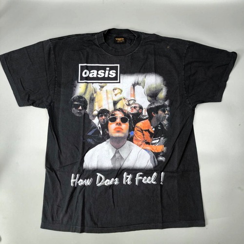 OASIS How does it feel オアシス Tシャツになります。 ※ビンテージ加工の新品未使用品になります。 【サイズ】 XL 肩幅: 53cm 袖丈: 19cm 身丈: 75cm 身幅: 54cm ※サイズ表記は目安です。 縫製製品は特性上、若干の誤差はお許しください。